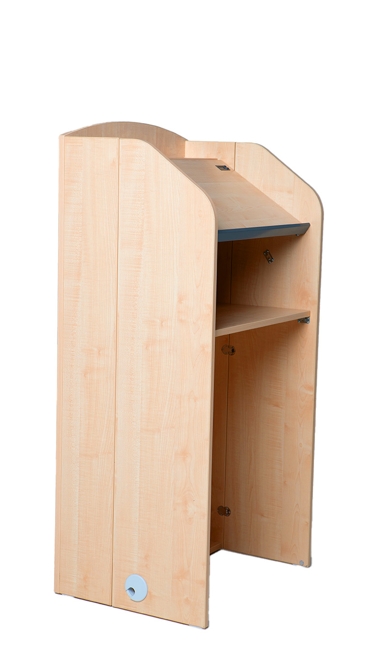 An attractive new lectern that folds inwards for storage. The angled platform is adjustable to 20° and 40° to suit a laptop/tablet or paper notes and cable management is provided through to ground level. Three finishes are available Black, Maple, or Beech.