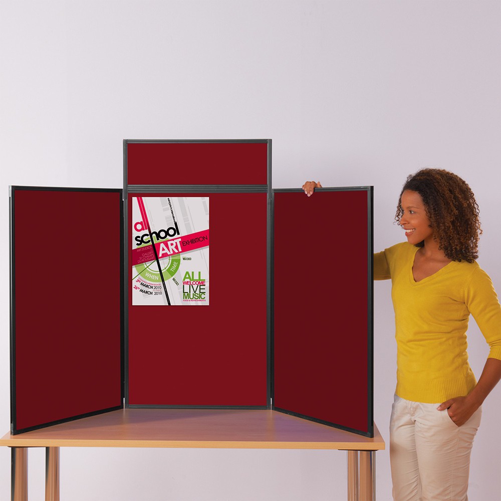 A Lightweight Tabletop Folding Display, in portrait orientation, ideal for small presentations and displays, course work or exhibitions.