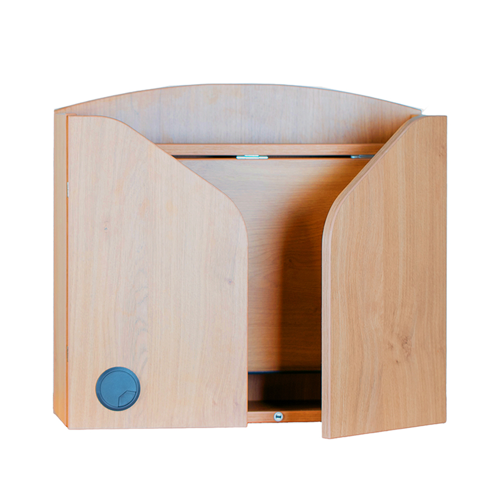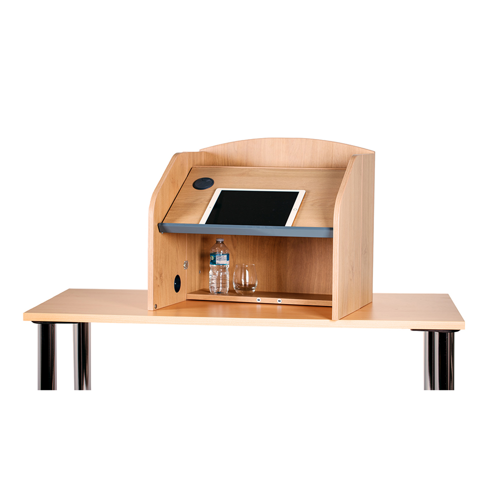 A traditional looking desktop lectern with a large sloping shelf and paper ledge.