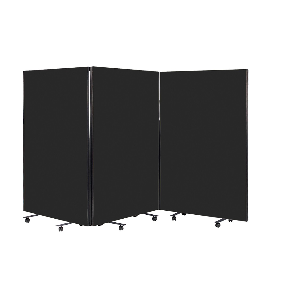 Mobile set of screens with stabilising feet. This popular mobile triple screen set is supplied with two way linking strips and castor feet giving maximum safety and mobility.