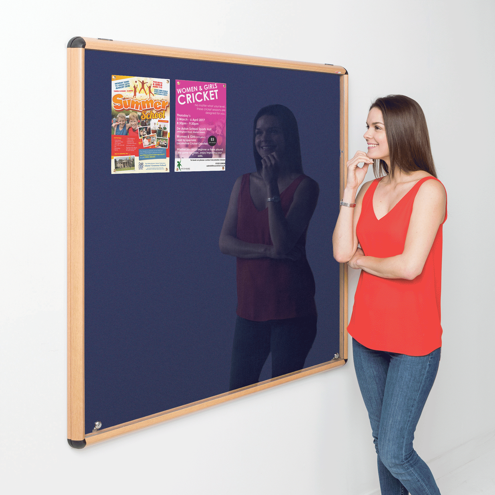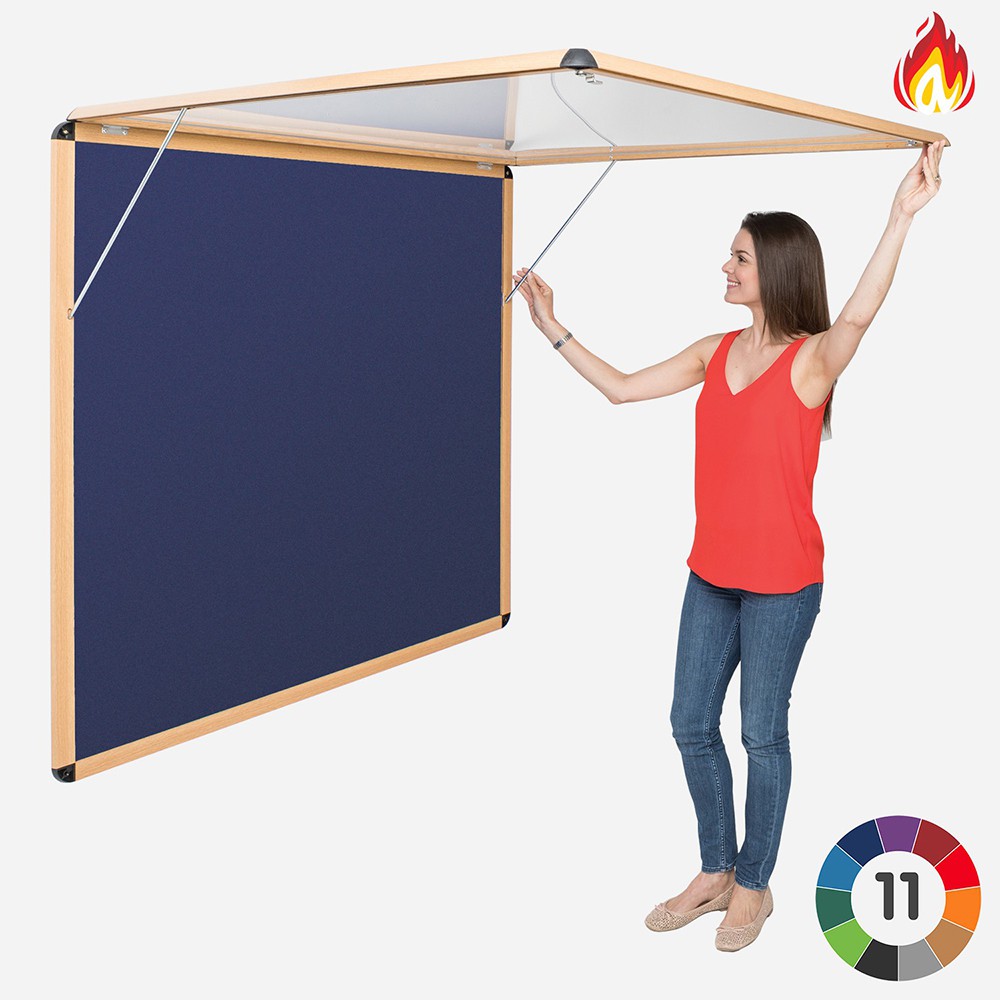 New wood effect top hinged fire resistant lockable noticeboards are designed to protect notices against casual interference in busy corridors, ideal for use within educational establishments.